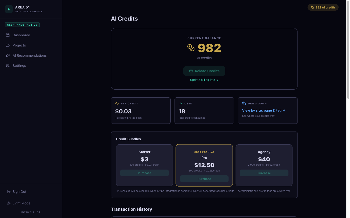 A gold credit badge in the top-right of every page shows your live balance. Click for a full transaction ledger — every debit, every top-up, every tag, with timestamps. Atomic deduction with row-locked database transactions.