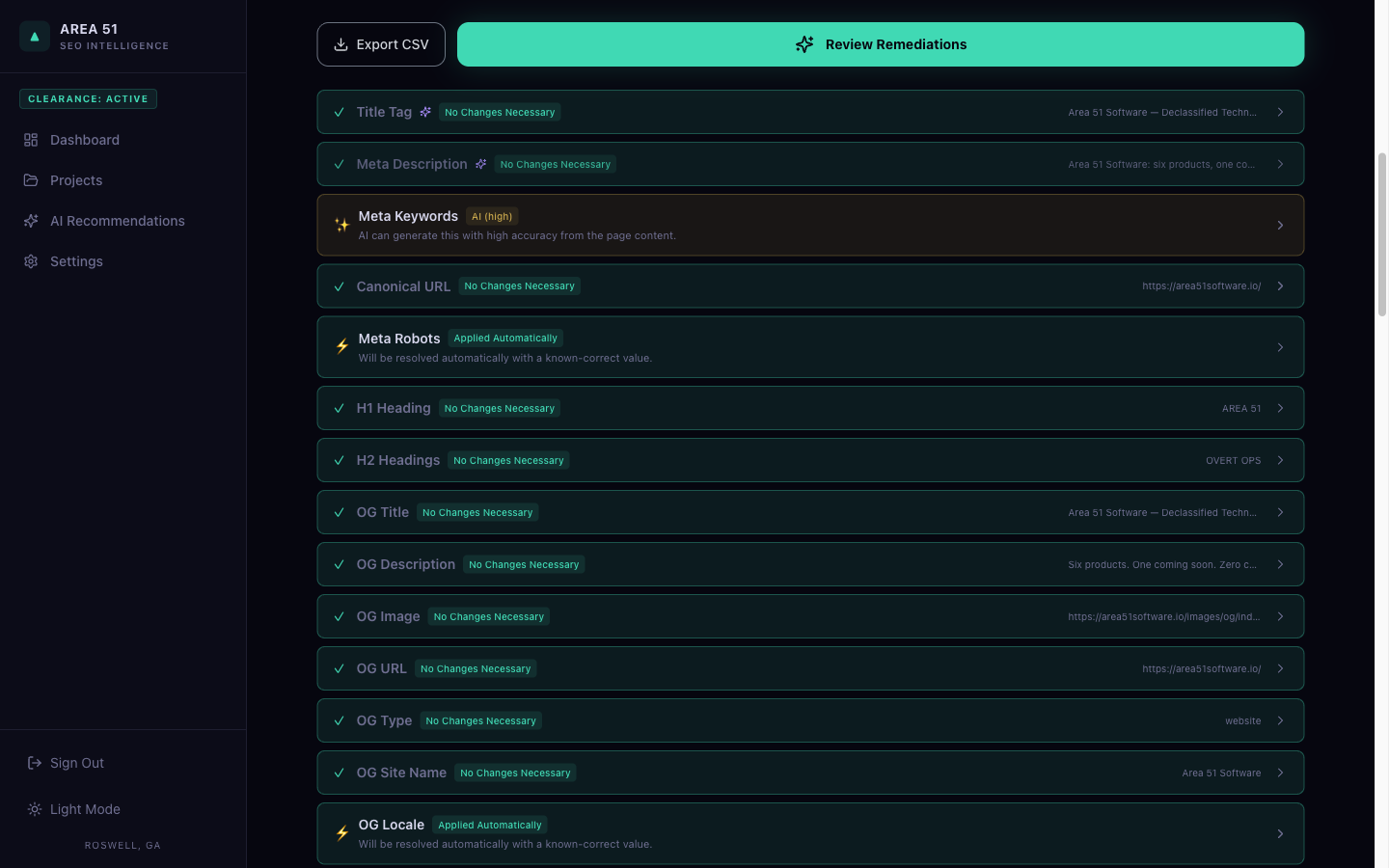 Most SEO tools charge per query. Overt Ops resolves the majority of tags before AI ever runs — from your HTML and your project profile. The remaining 17 tags are AI-enhanced: not just filling missing values, but improving existing ones with full page context — rewriting to conform to length rules, proper syntax, and the signals SEO and AEO engines expect. Two scan modes: Scan & Remediate (zero AI, zero credits) and Scan & AI Remediate (AI per page with live progress bar).
